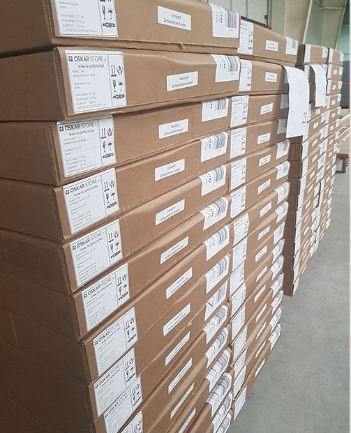 Только каркасы из ЛДСП и только в разобранном виде упаковываются в картон на полуавтоматической линии без использования клейкой ленты (скотча). На каждую упаковку клеится этикетка с наименованием и юридическим адресом производителя, наименованием клиента и номером заказа, краткой информацией об изделии.
