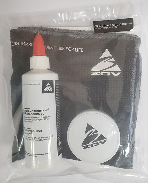 Столешницы фабричного производства изготавливаются на современном высокотехнологичном оборудовании с применением только качественных материалов от ведущих мировых производителей и имеют влагостойкую пропитку, которую можно узнать по зеленоватому оттенку ДСП на спиле. При заказе столешницы «ЗОВ» вы получаете сервис-пакет со специальными средствами (антиадгезивное средство и однокомпонентный ПУР-преполимер), а также салфеткой для дополнительной обработки открытых участков изделия (места врезки мойки, кранов, варочных поверхностей) от влаги и соединения их между собой при монтаже. Все предметы сервис-пакета оформлены в узнаваемой стилистике «ЗОВ».